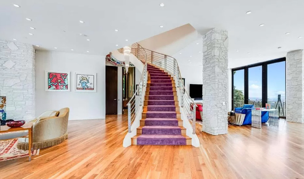 Interiors: Stone Fireplace, Colored Stairways and Fountain.